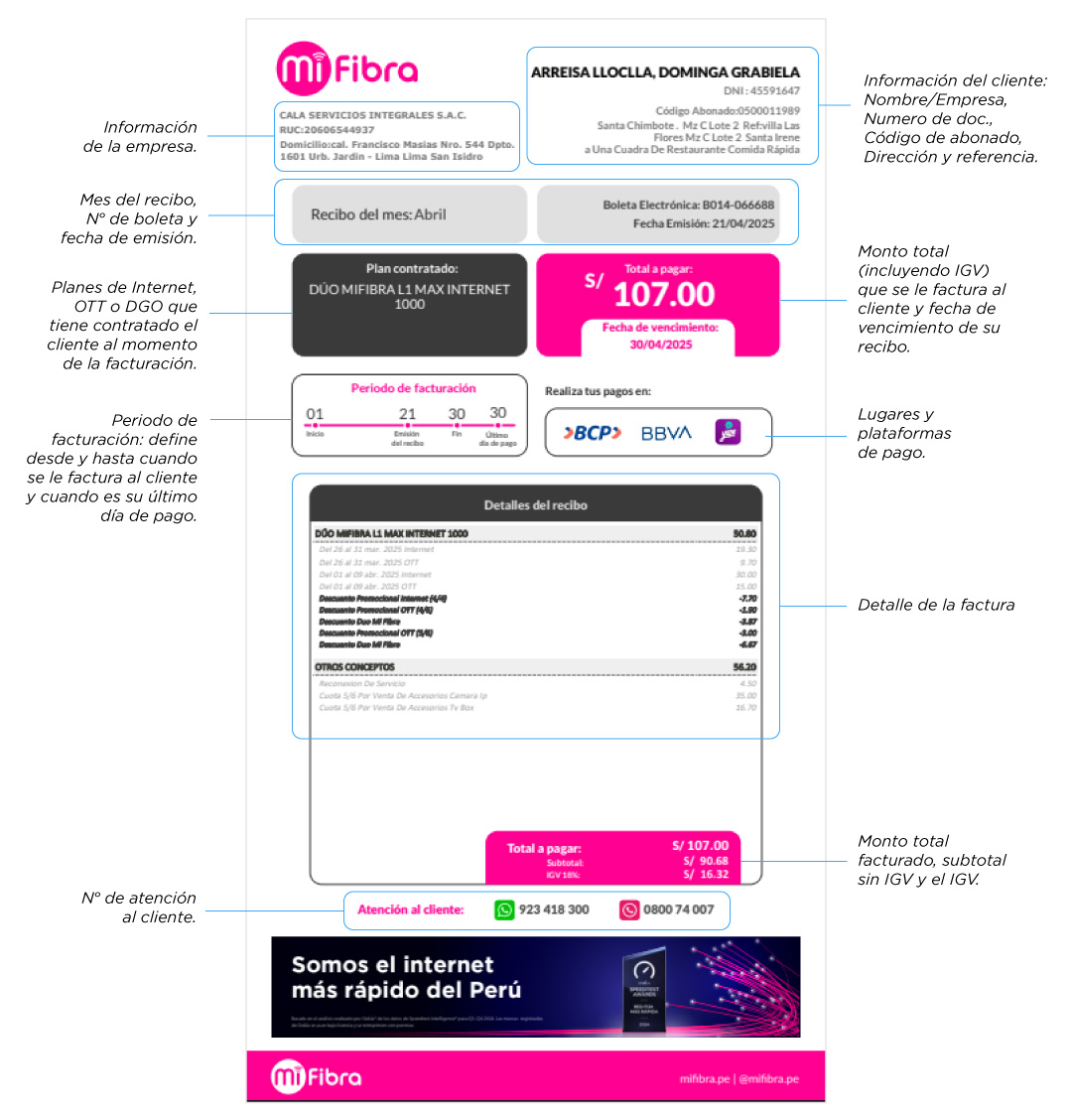Cada mes te llegará tu recibo según tu ciclo de facturación al correo electrónico que brindaste al contratar el servicio de MiFibra.